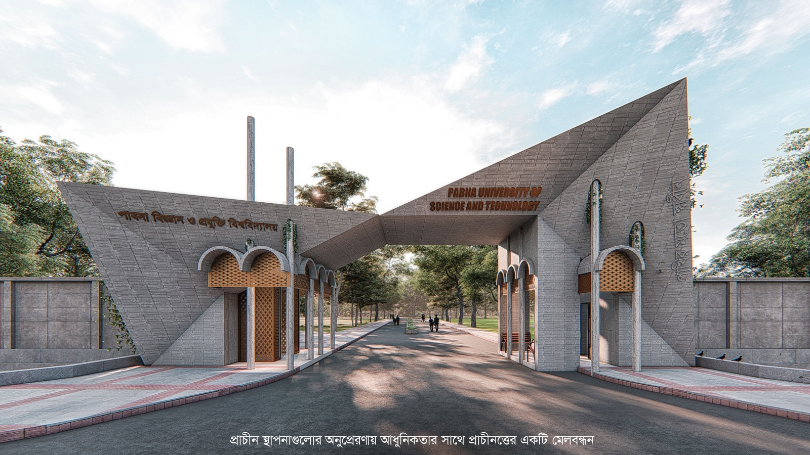The 3D exterior design of the main gate of Pabna University of Science and Technology embodies the concept of freedom and openness, inspired by the idea of being as free as a bird. The design features a sleek and modern aesthetic, with clean lines and a minimalist approach that evokes a sense of liberation and unrestricted movement. The gate’s structure is composed of a series of curved and angular elements that seem to soar upwards, much like a bird in flight, creating a sense of dynamism and energy.